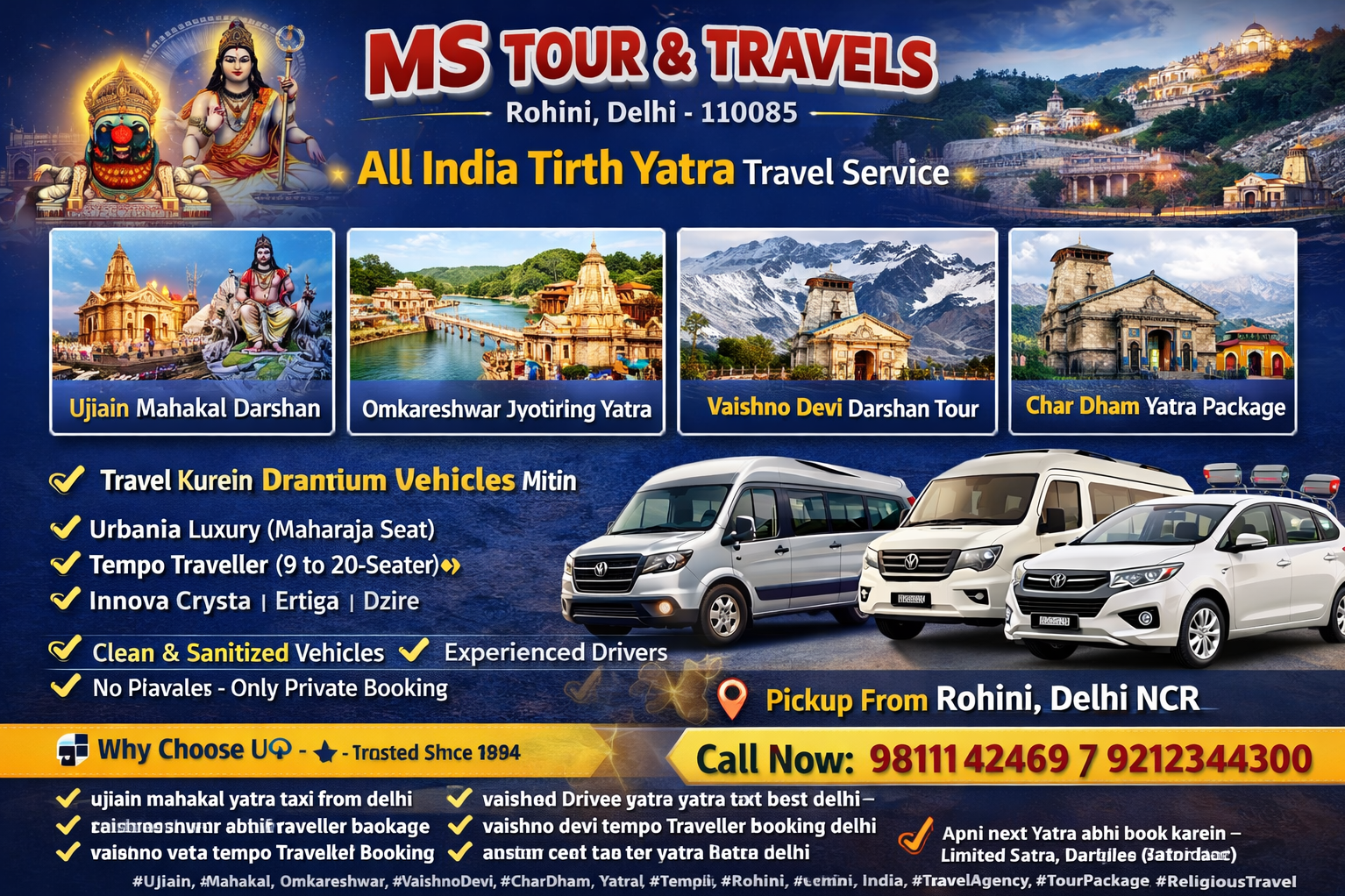 Ujjain mahakal yatra taxi from delhi, Omkareshwar jyotirling tour package from delhi, Vaishno devi tempo traveller booking delhi, Urbania on rent for religious tour delhi, Tempo traveller for char dham yatra, Delhi to ujjain taxi service, Delhi to vaishno devi cab booking, Best travel agency for tirth yatra delhi, All india temple tour package from delhi, Religious tour taxi service near me,