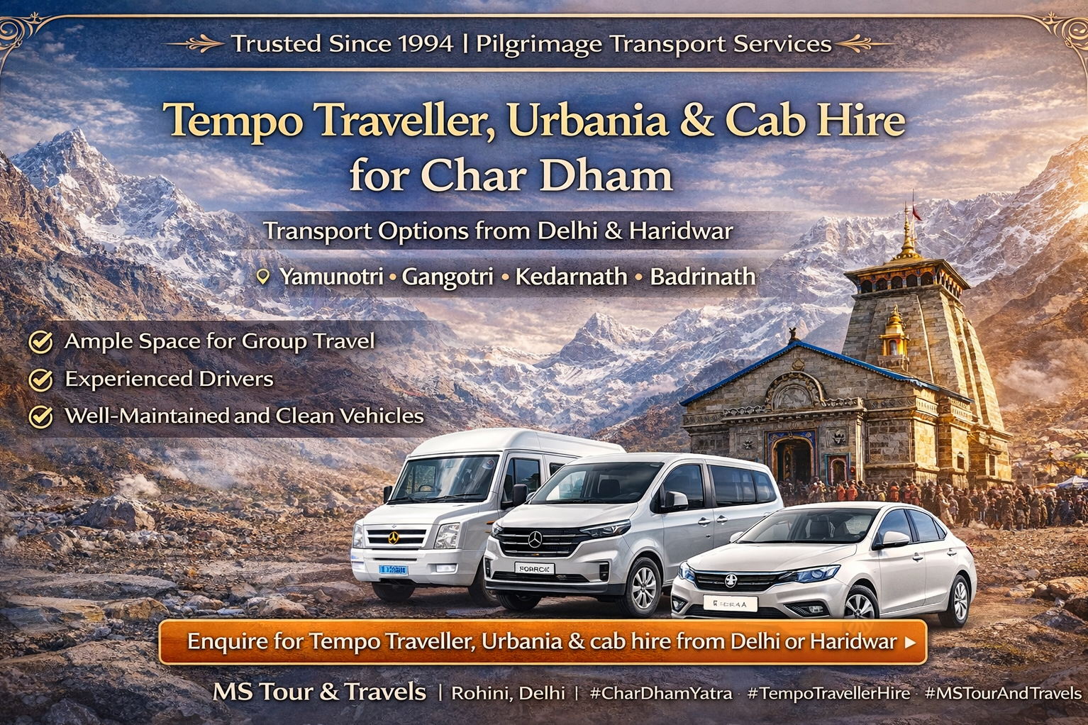 MS Tour & Travels (Trusted Since 1994) offers reliable Char Dham Yatra transport services including Tempo Traveller, Urbania, and cab hire options from Delhi and Haridwar.