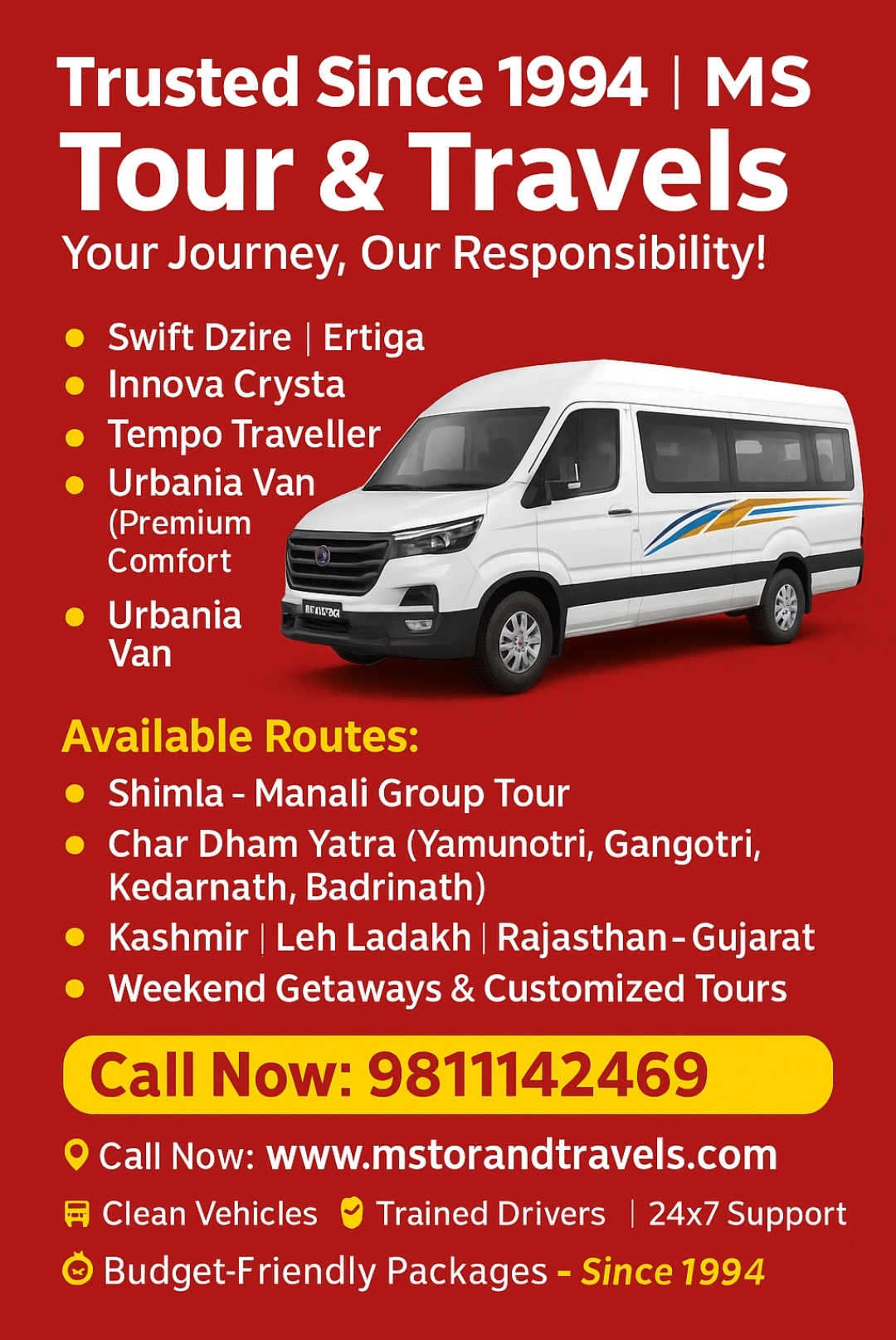 #MSTourAndTravels #TrustedSince1994 #UrbaniaVan #TempoTravellerDelhi #DelhiCabBooking #ShimlaManaliTour #CharDhamYatra #LuxuryTravel #OutstationTrips #TravelAgencyDelhi #FamilyTourPlanner #IndiaTravelExperts